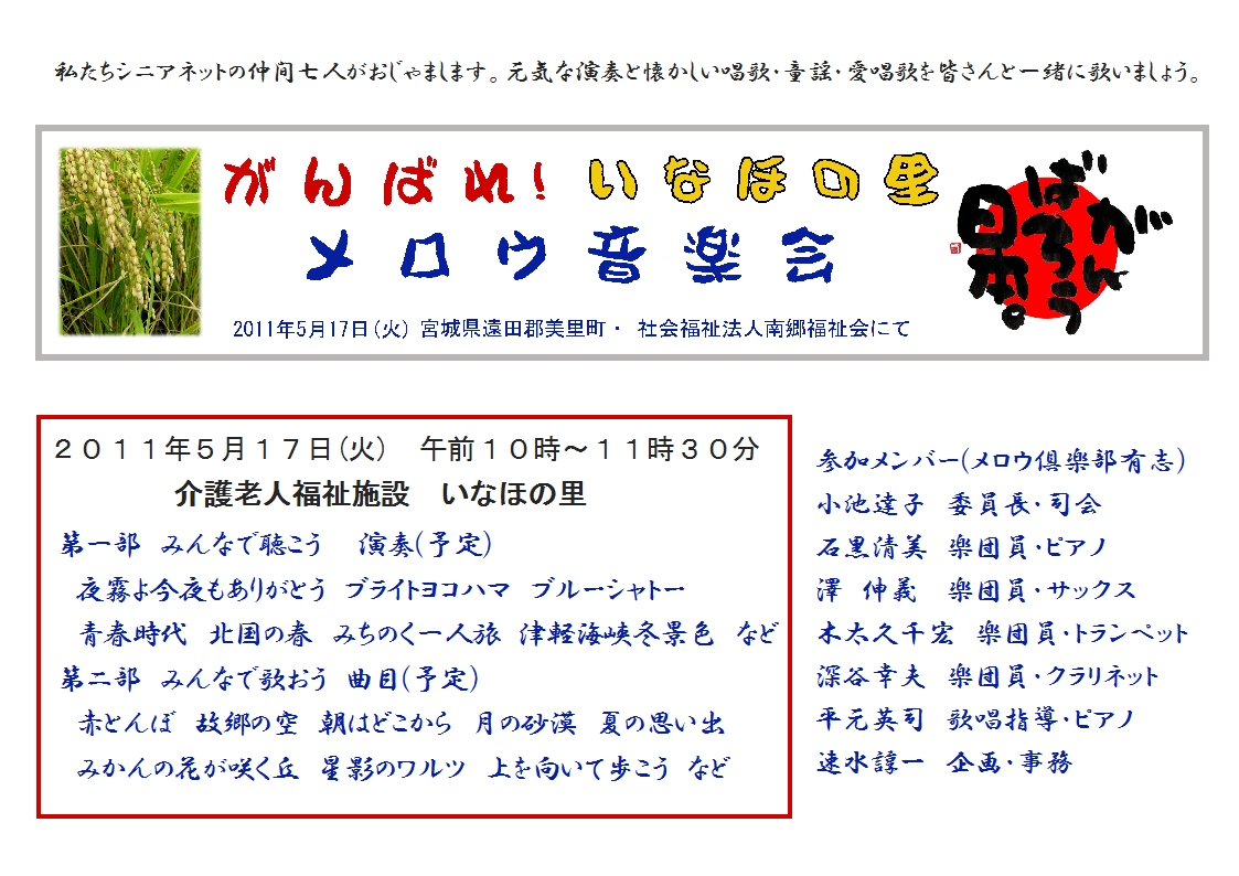 5月17日(火)にシニアネットの仲間7人で介護老人施設いなほの里(宮城県恩田郡美里町)に元気を届けに行きます。
